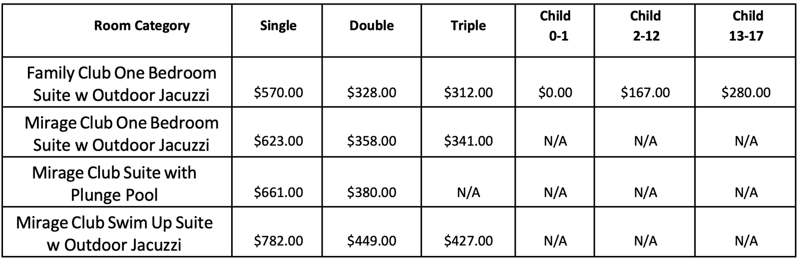 Rates are per person, per night. Example: Mirage Club One Bedroom Suite with Outdoor Jacuzzi, May 12-16, 2027, Double Occupancy: $358.00 x 2 people x 4 nights = $2,864.00.