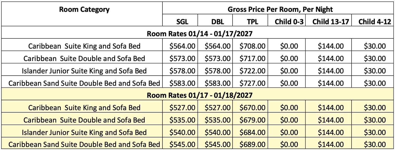 Rates are per night, based on occupancy. Example: Double Occupancy, Caribbean Suite King and Sofa Bed for three (3) nights January 14-17, 2027: $564.00 x 3 nights = $1,692.00.