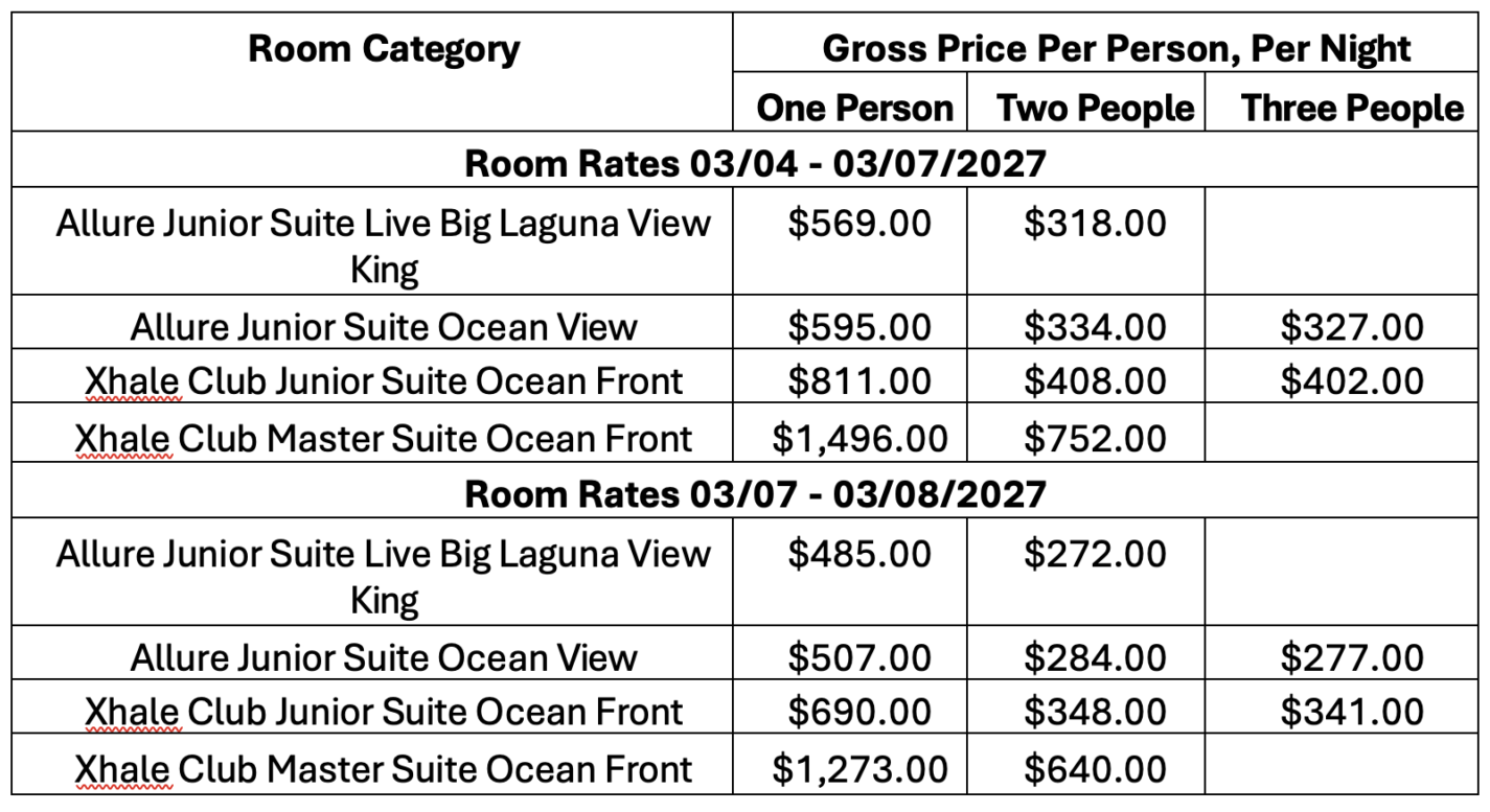 Rates are per person, per night. Example: Allure Junior Suite Live Big Laguna View King, March 4-8, 2027, Double Occupancy: $318.00 x 2 people x 3 nights (March 4-7, 2027) = $1,908.00. $1,908.00 + ($272.00 x 2 people x 1 night (March 7-8, 2027) = $2,452.00.