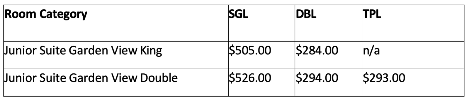 Prices are quoted per person, per night. Example: Junior Suite Garden View King, Double Occupancy for 3 nights: $284.00*2 people*3 nights= $1,704.00