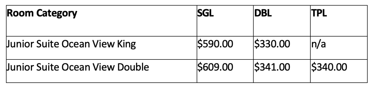 Prices are quoted per person, per night. Example: Junior Suite Ocean View King, Double Occupancy for 3 nights: $330.00*2 people*3 nights= $1,980.00