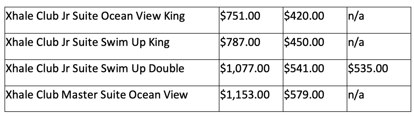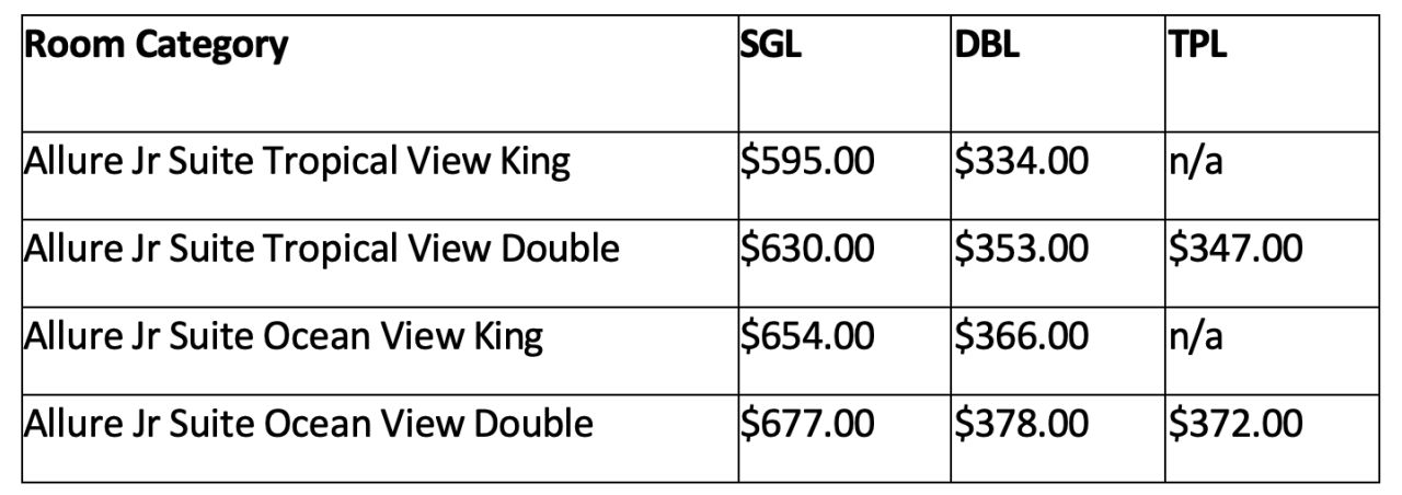 Prices are quoted per person, per night. Example: Allure Junior Suite Tropical View King, Double Occupancy for 3 nights: $334.00*2 people*3 nights= $2,004.00