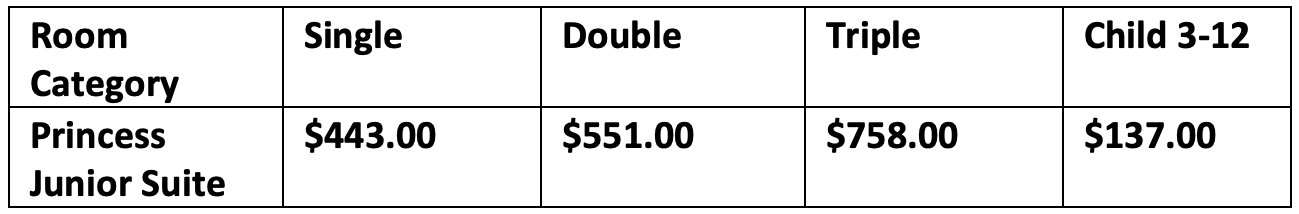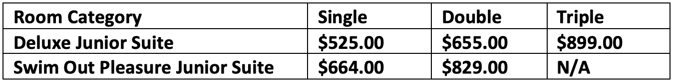 Prices are quoted per room, per night. Example: Deluxe Junior Suite, Double Occupancy for 3 nights: $655.00 *3 nights= $1,965.00.
